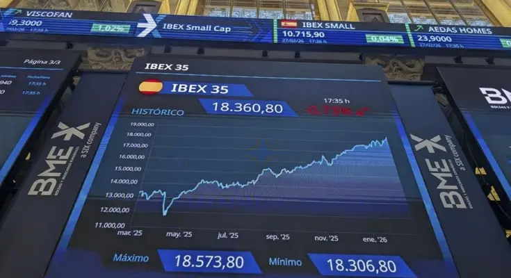 Madrid. A mediodía, la Bolsa española tiene una caída del 2,26 % y supera los 17.900 puntos. El precio del petróleo Brent sube un 7,6 % por el incremento de tensiones en Oriente Medio tras el ataque de Estados Unidos.